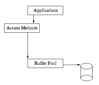 As you can see from this diagram, the application makes calls into the Access Methods, and the Access Methods use the underlying shared memory buffer cache to hold recently used file pages in main memory.
