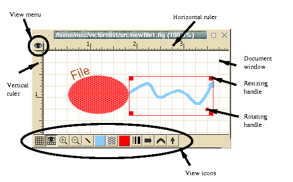 Figurine 1.0 ManualViews and documentsIn Figurine, you can have several documents loaded at once. Each of these documents can have one or more associated views, which can be thought of as a window onto the document. Drawing is done in any of these views, the results being updated in all the view windows for that document.![]() This is an example view window. The main area is the displayed document where all drawing is done. Along the bottom are the view icons that set the drawing parameters like linewidth, etc. Along the left and the top are the rulers, which can be used to pan round the document. The eye icon in the topleft of each view, when selected, opens the View menu. Right clicking on this icon will reset the ruler offsets to 0,0 and redraw the document.