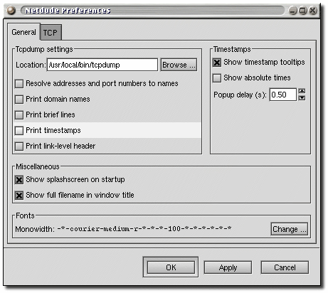 Netdude's preferences dialog. The options should be pretty obvious. You can specify the tcpdump binary to use for displaying the tcpdump output, adjust the tcpdump output, configure the way packet capture timestamps are displayed and select fonts, among other things. Notes