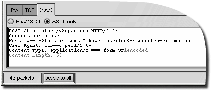 Editing raw data using the hex editor. By clicking into the editor field, the cursor is placed either over a hex digit or the corresponding ASCII display on the right. The actual cursor is blue, the corresponding indicator in the other display part in a bright gray [1]. But our editor is better than that. For normal text, editing using the hex editor is cumbersome. You can use ASCII mode in those situations -- here the editor behaves more like a normal text editor. You can literally type up packet content!