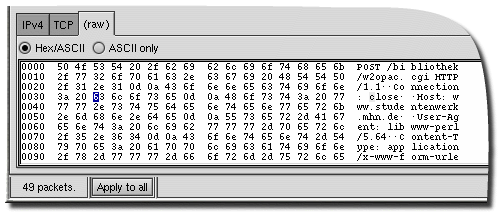 ">Editing raw packet dataWhenever Netdude encounters data that is not specifically interpreted by some protocol plugin, the data is displayed using a hex editor, in a tab titled "(raw)". This editor supports two modes of operation -- hex and ASCII. In hex mode, it works like usual hex editors. An image of an editing session is shown below: