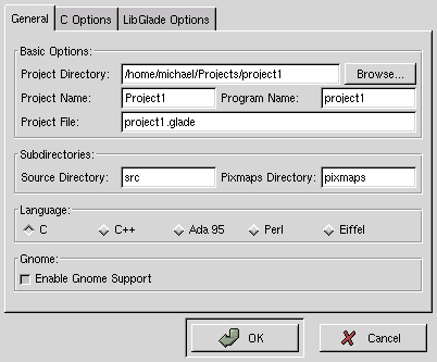 Selezionate il linguaggio di programmazione in cui Glade scriverà il codice. Al momento della scrittura di questo documento le opzioni possibili sono: C, C++, Ada95, Perl ed Eiffel.