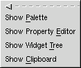 Il menu VistaMostra PaletteMostra la palette, se era nascosta, oppure la porta in primo piano se era visibile ma coperta. Mostra Editor delle proprietàMostra la finestra di dialogo delle proprietà, se era nascosta, oppure la porta in primo piano se era visibile ma coperta. Mostra Albero dei widgetMostra la finestra di dialogo con l'albero dei widget, se era nascosta, oppure la porta in primo piano se era visibile ma coperta. Mostra AppuntiMostra gli appunti con i widget, se erano nascosti, oppure li porta in primo piano se erano visibili ma coperti.