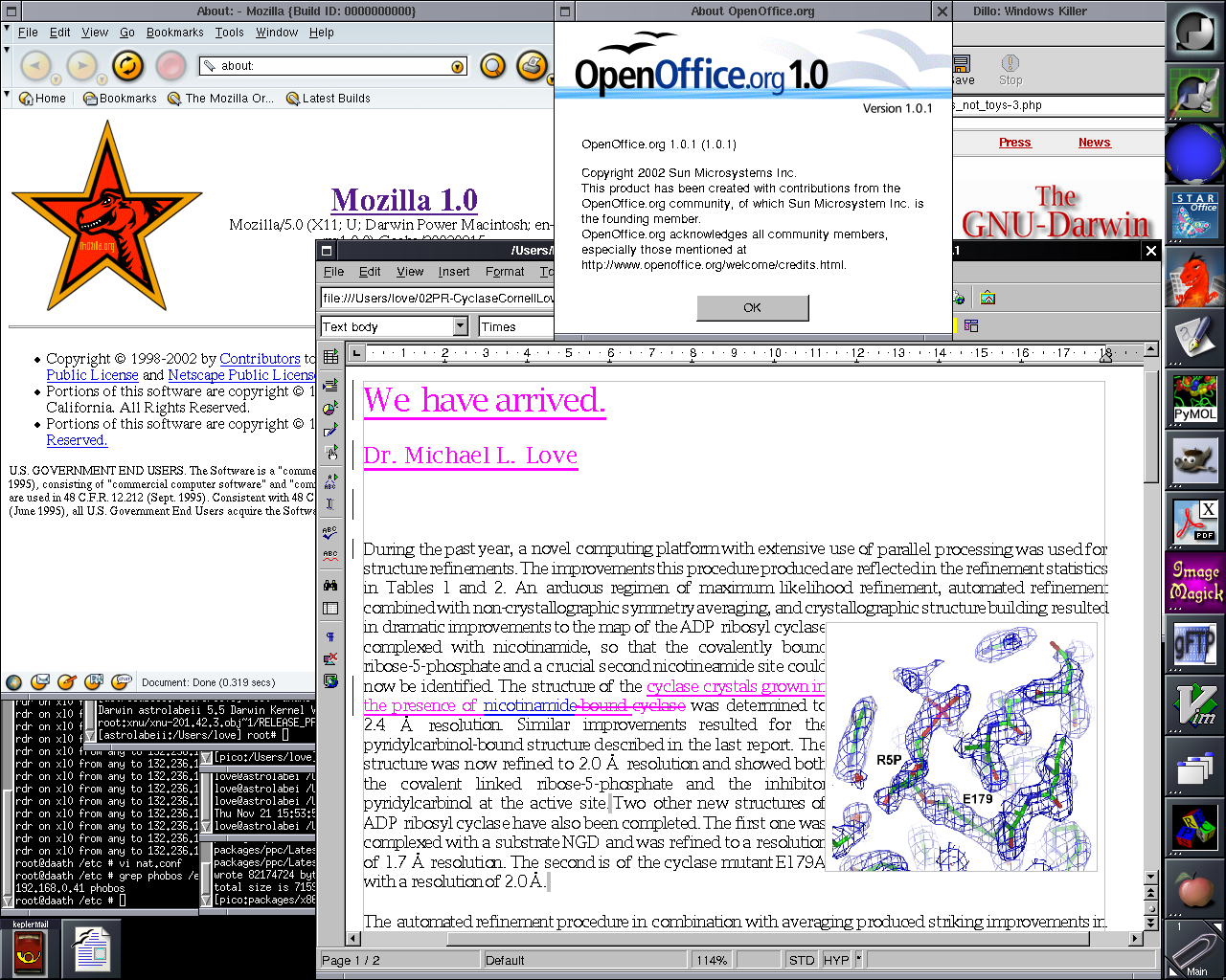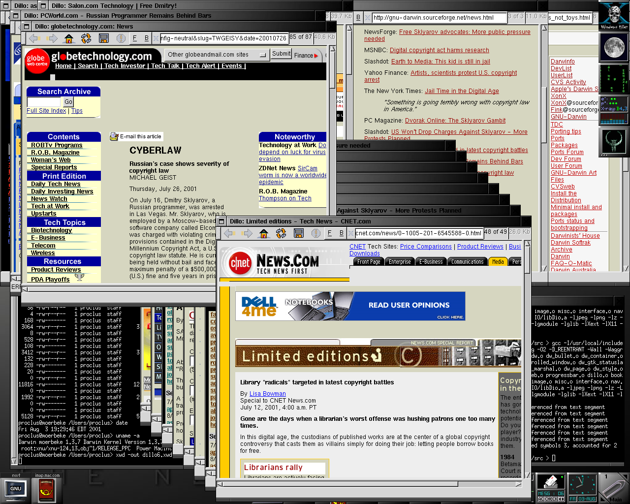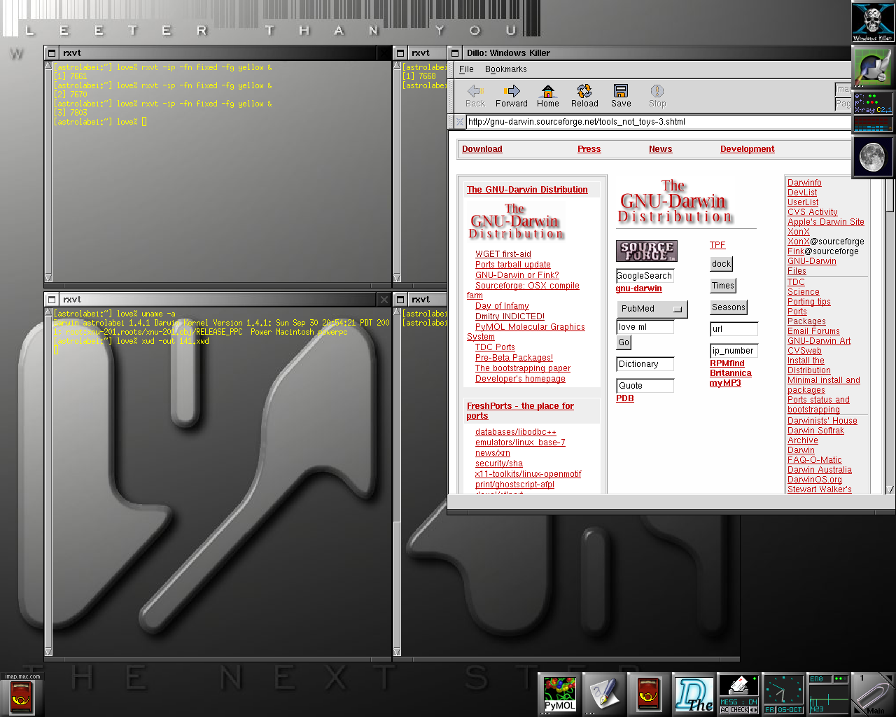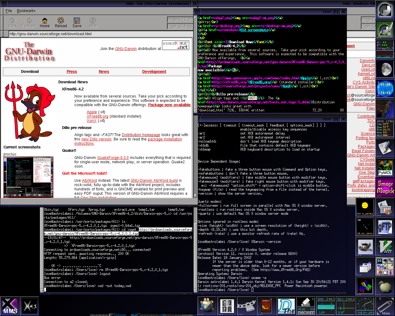 Darwin download and installation information, including GNU-Darwin GUI screenshots, iso images and package information, scientific software, and more is available on our future new website, which is under construction. Help and FAQ info are also available. Binary package instructions are provided for x86 (i386), and ppc (PowerPC, Darwin, Mac OS X). For news about software updates, monitor the Distribution forum via email or the RSS channel which is shown in the news bar to the right. SourceForge also provides a file release channel. If you are looking for the Download news archive page, including the old Linux, PDF, OpenOffice, Dillo, AbiWord, and GNOME news items, here it is.