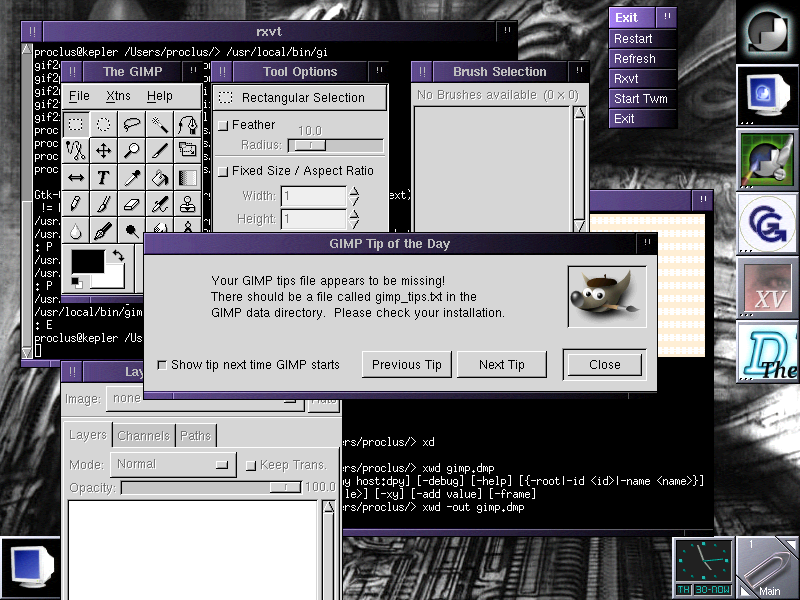 manipulation program, fully working with Script-fu and all plugins thanks to sordid, though no python/perl scripting support. Use gimp --no-shm