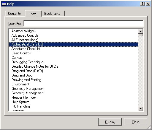 The Index tab page shows a list of topics that are described in the Qt documentation. You can scroll through the list to find a topic you are looking for or enter a search word in the Look For