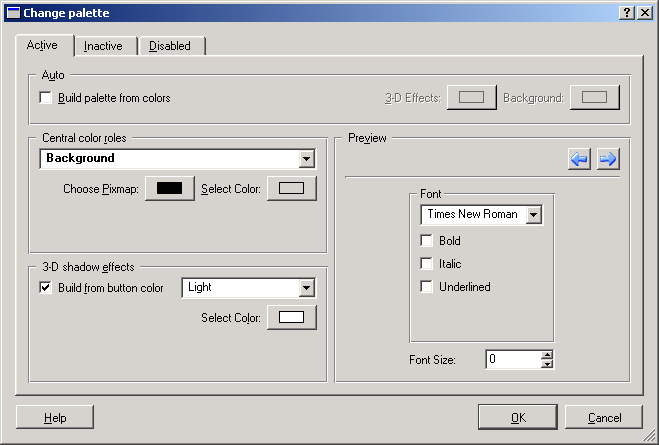 In this area, you can select pixmaps and colors for the color role that is currently selected in the color role combo box. Please see the documentation for QPalette or Programming with Qt for a description of the color roles. Make sure that you choose colors with good contrast!