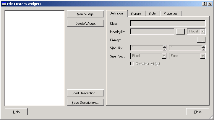 This dialog lets you create descriptions for custom widgets; i.e., widgets that are not included in Qt but that you have written yourself or purchased from a third-party manufacturer. You can invoke it by selecting Tools/Custom/Edit Custom Widgets. The unlabeled list box to the left always shows the list of custom widgets known to Qt Designer.