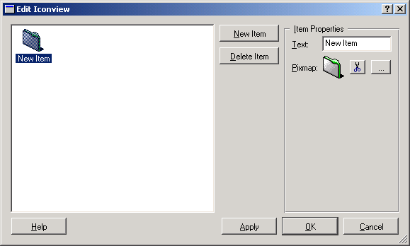 In this area, you can specify the pixmap and the label to be displayed for the currently selected icon. To change the label, enter the new text in the field. To change the pixmap, which is displayed next to the word Pixmap, click on the button labeled .... Clicking on the scissors icon removes the pixmap so that the current entry is represented only by its label.
