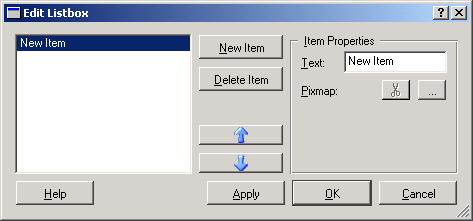 In this area, you can specify the pixmap and the label to be displayed for the currently selected entry. To change the label, enter the new text in the Text field. To assign or change a pixmap, which is displayed next to the word Pixmap, click on the button labeled .... Clicking on the scissors icon removes the pixmap so that the current entry is represented only by its label.