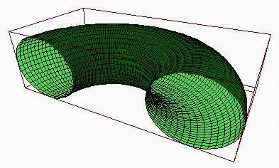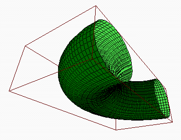 Um dieses Bild zu erzeugen, muss man offenbar eine Karte der Oberfläche anfertigen. Dies geschieht mit Hilfe der folgenden Befehle >x=linspace(0,pi,80); y=linspace(-pi,pi,40)'; >X=cos(x)*(1+0.5*cos(y)); Y=sin(x)*(1+0.5*cos(y)); Z=0.5*sin(y); >framedsolid(X,Y,Z,3); Der zusätzliche Parameter 3 ist ein Streckungsfaktor, der dafür sorgt, dass alles schön im Bild ist. Der Blickwinkel kann mit Hilfe von view eingestellt werden. >view(7,1.5,-1,-0.5); framedsolid(X,Y,Z,3);