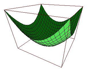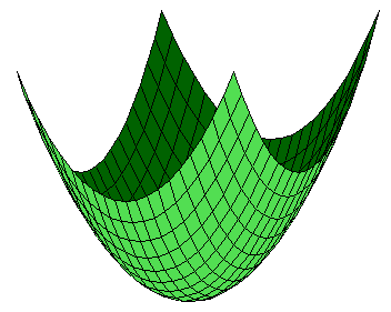 Dieser Plot wird mit >x=-1:0.1:1; y=x'; mesh(x^2+y^2); erzeugt. Dabei laufen beide Variablen von -1 bis 1. x ist dabei ein Zeilenvektor und y ein Spaltenvektor. Werden solche Vektoren verknüpft (hier durch +), so entsteht eine Matrix aus Werten die alle möglichen Kombinationen enthält, hier also die Elemente x[i]^2+y[j]^2 für alle i und j. Diese Matrix wird bei der obigen Zeichnung als Niveauhöhe benutzt. Wie im vorigen Paragraphen kann man auch mit >f3dplot("x^2+y^2",-1,1,-1,1);