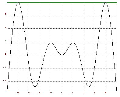 Wie funktioniert das? Der Vektor 2:999 ist einfach der Vektor der Zahlen 2,3,4,...,999. Setzt man diesen Vektor als Index für z ein, so werden alle Elemente mit diesen Indizes aus z ausgewählt und in einen neuen Vektor eingetragen. Anschließen werden zwei solche Vektoren miteinander verglichen. Dies ergibt 1 an allen Stellen, an denen der Vergleich zutrifft und 0 sonst. Dann werden noch die beiden Vergleichsresultate gliedweise mit und verknüpft. Die Summe der vorhanden Einser zählt genau das, was wir wollen. Dieses Beispiel demonstriert recht gut, was man mit Euler anfangen kann. Es ersetzt in vielen Fällen eine Programmiersprache. Dabei stehen zudem noch mächtige Funktionen in einfacher Weise zur Verfügung, für die man sonst eine Bibliothek bräuchte. Euler ist quasi ein interaktives Laboratorium der Numerik. Einfache PlotsDa Funktionen auf Vektoren gleidweise wirken, könnte man einen einfachen 2D-Plot folgendermaßen erzeugen >t=-5:0.01:5; xplot(t,sin(2*t)*t); Dies erzeugt einen Plot der Funktion sin(2*t)*t zwischen -5 und 5, weil t ein Vektor ist, der die Werte -5,...,5 enthält mit einer Schrittweite von 0.01. Das Ganze sieht dann so aus