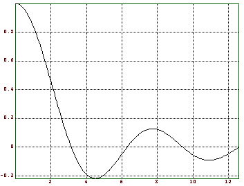 Zuerst verschaffen wir uns einen Überblick durch Plotten. >f="sin(x)/x"; >fplot(f,epsilon,4*pi); Dieses Mal haben wir darauf verzichtet, eine Fallunterscheidung zu machen, und speichern die Funktion einfach als Ausdruck in einem String. Deswegen werden wir im Punkt 0 immer eine Fehlermeldung erhalten. Um das zu vermeiden, plotten wir von einem kleinen positiven Wert epsilon aus. Dieser Wert wird auch dazu verwendet, Zahlen auf ungefähre Gleichheit zu testen (a~=b). Nun berechnen wir die erste Nullstelle, die natürlich Pi ist. >longformat; secant(f,3,4) Von Interesse ist vielleicht auch das Integral, die wir sowohl mit Gauß als auch mit Romberg berechnen, und die Ableitung. >romberg(f,epsilon,pi)