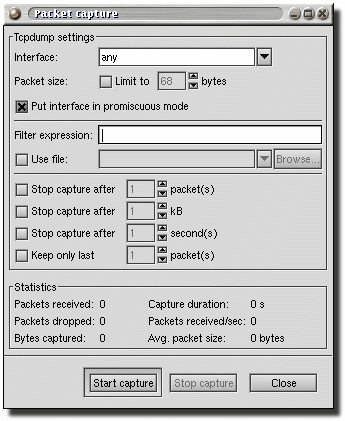 ">Performing Live CapturesInstead of loading files from disk, you can also use Netdude to capture them directly off one of the interfaces on your machine. You will need appropriate permissions -- usually root -- to do this. You can access the capture dialog through the "File -> Capture..." path. If you're lacking sufficient privileges, the menu item will be grayed out. Netdude's capture dialog. You can select the interface on which to listen in the upper part of the dialog, specify filters in the middle and select trace end conditions in the lower part. You can stop the capture after a given number of packets, limit the capture size, limit the capture time or all of the above. Additionally, you can choose to limit the amount of captured packets that are kept in memory to a given number. If you set this value to k, all packets snooped more than k packets ago are dropped, so the capture will not slowly eat up your machine's memory. During the capture, you'll see some obvious statistical information updating in the bottom part of the dialog. You can stop the capture at any time using the buttons. Each started capture gets its own trace. |