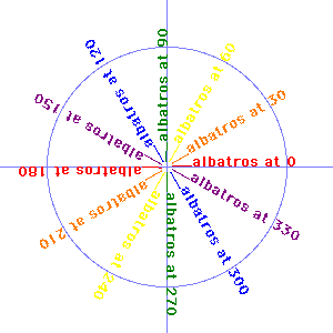 PIDDLERotation TestThe output above was generated by piddleQD (left) and piddlePIL (right). """rottest.py This program tests drawing of rotated strings. """ # create a 300x300 canvas -- modify this code to use whatever # canvas type you wish to test #from piddleQD import * #try: canvas.close() #except: pass #canvas = QDCanvas( size=(300,300) ) from piddlePIL import * canvas = PILCanvas( size=(300,300) ) canvas.defaultFont = Font(bold=1) canvas.defaultLineColor = (blue + white)/2 canvas.drawLine(0,150, 300,150) canvas.drawLine(150,0, 150,300) s = " __albatros at " w = canvas.stringWidth(s) canvas.drawEllipse(150-w,150-w, 150+w, 150+w, fillColor=transparent) orange = (red+yellow)/3 colors = [red,orange,yellow,green,blue,purple] cnum = 0 for ang in range(0, 359, 30): canvas.defaultLineColor = colors[cnum] s2 = s + str(ang) canvas.drawString(s2, 150, 150, angle=ang) cnum = (cnum+1) % len(colors) canvas.flush() if canvas.__class__.__name__ == 'PILCanvas': canvas.getImage().save("rottest-pil.gif") http://www.strout.net/info/coding/python/piddle/rottest.html Last Updated: 5/31/99 . . . . . . webmaster@strout.net |