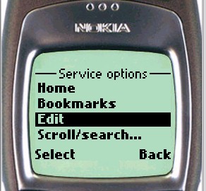 (Note that the first three items on the softkey menu, Home, Bookmarks and Edit are defaults with standard meanings provided by the Nokia browser.)