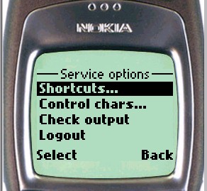 The following screens show the appearance of the control characters page on the Nokia phone (the functionality is similar on the UP browser, although the operation of the browser makes the appearance slightly different):