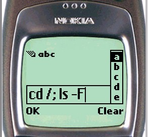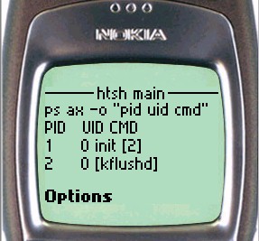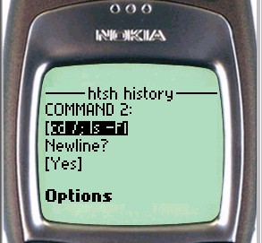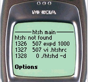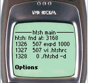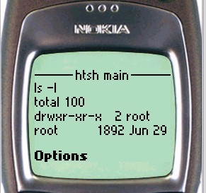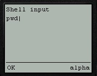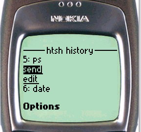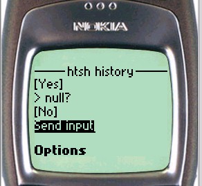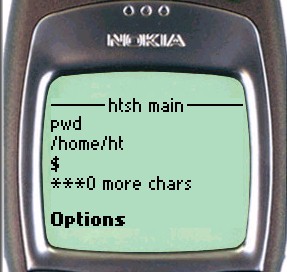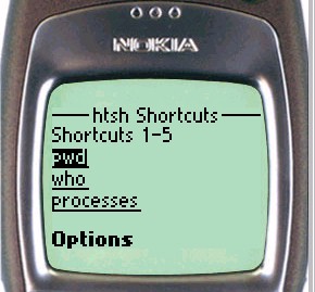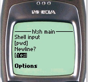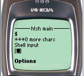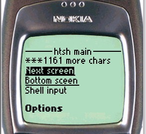 On the Nokia phone, to enter input to the shell, simply scroll down the page until the shell input textbox is visible. For UP browsers, click the To htsh input hyperlink.