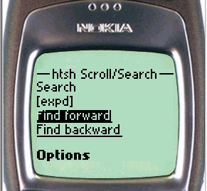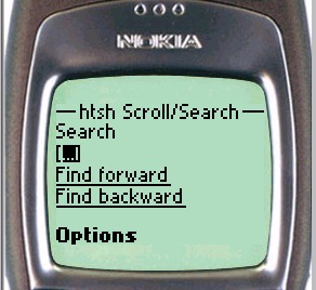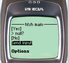 Nokia WAP phones run a browser which provides superior handling of forms and input fields, as well as true modeless access to the softkey menus, and htsh takes advantage of these features. In particular: