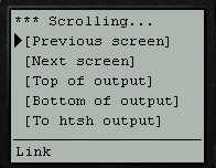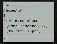 Note that when scrolling through the output buffer, htsh will attempt to display whole lines of output where possible. This means that htsh will sometimes display fewer characters than the permitted maximum (as specified by the set outputwindowsize initialisation file command).