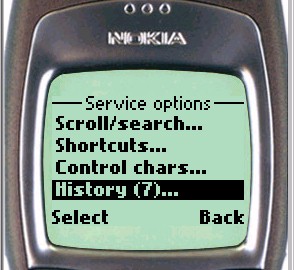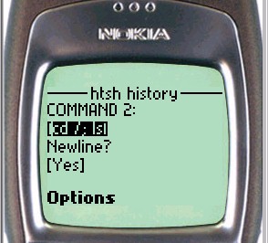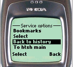 If the history list is long, htsh allows you to scroll forward or backward through it. Scrolling options, prev history and next history, as well as the option to return to the htsh main page(s), are provided either in the softkey menu (Nokia phone) or at the foot of the history page (UP browser).