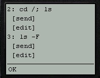 The process of editing a command is similar to entering shell input. When editing an item, in addition to changing the text of the item, it is also possible to modify the settings of the "newline?" and "> null" checkboxes as desired. The item can then be re-submitted by pressing the corresponding send hyperlink.