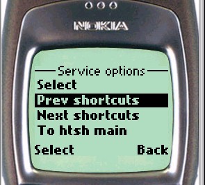 If the list of shortcuts is long, then it will be displayed in blocks of a fixed number of items (set according to the set shortcutblocksize initialisation file command described earlier) with accompanying scrolling options (Next shortcuts, Prev shortcuts) to move backward and forward through the list of options. These options, as well as options to return to the htsh main pages appear under the softkey menu (Nokia phone) or at the foot of the shortcut list (UP Browser).