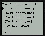The shortcuts defined in the .htshrc file with the "sc" command are made available to the user via a set of hyperlinks on the Shortcuts page. The shortcuts page appears as follows: