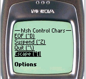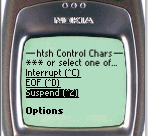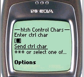 Since the keyboard of a WAP phone is limited, htsh provides a special page allowing control characters to be sent to the shell. A textbox may be used to send any standard control character to the Client Shell. To send for example, a Control-A, enter the letter "A" (upper or lower case) into the textbox, and click the send button. (To be precise, this feature causes the ASCII code whose numeric value is 0x40 (64 decimal) less than the entered character to be sent to the Client Shell.)