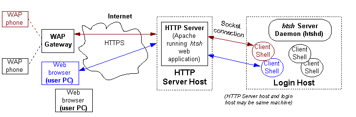 - (htsh) Client Shell: A process running a standard shell on the Login Host, which accepts input sent via the HTTP Server from the Client Browser and sends output back via the same route.