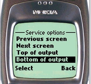 Options to scroll forward and backward through the output buffer are provided on the Scroll/Search page either as softkey options (Nokia phone) or hyperlinks at the foot of the page (UP browser).