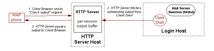 - Client Shell output is only ever sent to the Client Browser in response to submission of input. (There is no "push" of data from the HTTP Server to the Client Browser). This means that any output which isn't generated by the Client Shell within a short period of time after submission of the current user input will not be returned to the browser in the current request-response cycle. Instead, it will be "piggy-backed" with the output produced in response to the next request from the user's browser. (It is also possible to send a special command ("Check output") which simply requests that any outstanding output from the Client Shell is returned to the Client Browser.) This mode of operation is required since it is not possible for the Client Shell to definitively know whether or not a command has finished producing output. Therefore the Client Shell operates a timeout on the output, and if the timeout is exceeded, ceases transmitting output to the HTTP server.