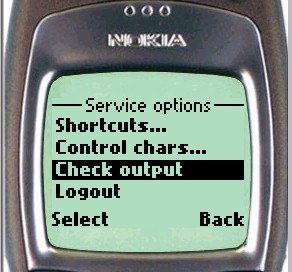 The Check Output option is provided in the htsh main page softkey menu (Nokia phone) or in the htsh menu page (UP browser).