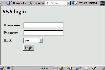 This screen allows the user to enter their username and password. If the HTTP server permits logging into a range of Login Hosts, these will be displayed in a menu on the login page and the user can select the desired Login Host. After entering the preceding information, the user clicks the Login hyperlink to enter htsh