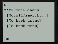 After the shell output comes a line of the form "*** X more chars". When a command generates more output than can be displayed in a single WAP browser page, htsh will show the first part of the output and use this line to show how much further output is available for viewing. This further output can be viewed using the "Output scrolling" options described below.
